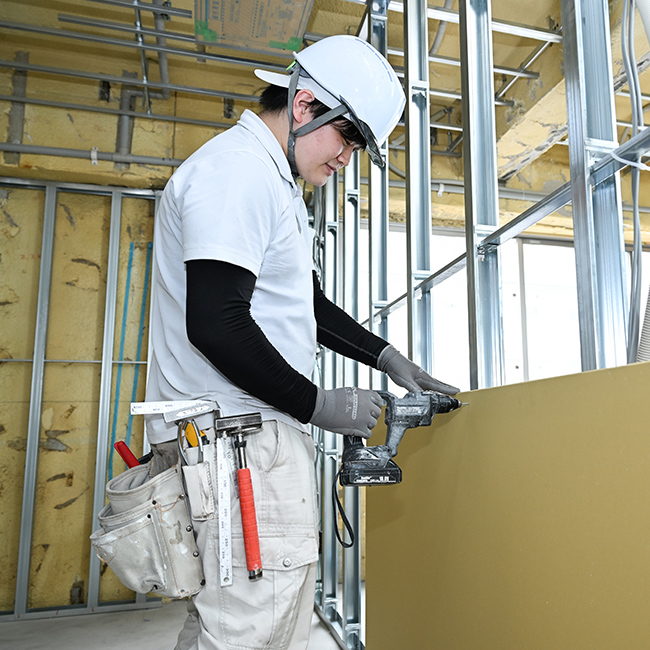 オフィスビルや病院、学校、商業施設などの内装工事(壁・天井づくり)を担当します。 軽量鉄骨(LGS)で骨組みを立て、石こうボードを張るなどの作業を行います。 何もなかった空間が、図面をもとにどんどん形になっていくやりがいのある仕事です。 最初は工具の使い方や図面の読み方から丁寧に指導 チームで作業するので、協力しながら進める現場が多い 体を動かすのが好きな人にぴったり